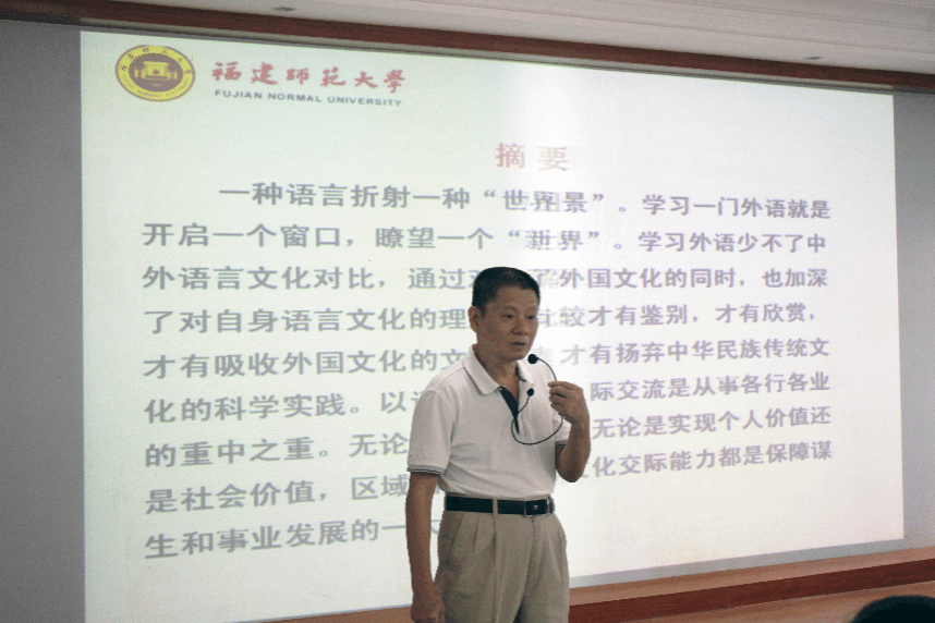 图1-1林大津教授开展“外语人生与职业发展视域下跨文化交际能力新探”讲座