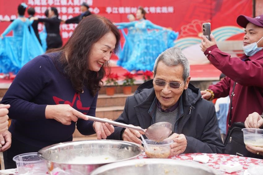 现场长辈们的欢声笑语此起彼伏,伴随着拗九粥的甜蜜香气,一箸一勺、一端一递、一谈一笑间,深厚浓郁的敬老情在默默传递,鲜艳亮丽的志愿红正焕发光彩,光辉璀璨的“福”文化在青年行动中传承延续。