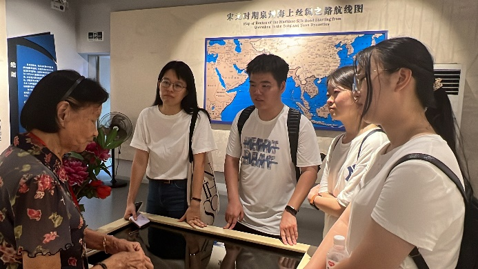 海交馆围绕“泉州湾古船及其伴随出土物、泉州宗教石刻、泉州外销瓷”等三大藏品精心布局,以海上丝绸之路的视角诠释古泉州与世界各民族交往交流交融的活动场景,采用声光电等科技手段,打造出“刺桐梦华图”沉浸式投影体验、“涨海声中万国商”宋元货运氛围投影、“泉州印度教造像舞姿”互动体验、郑和下西洋船队大场景视频等几十项数字化互动内容,生动呈现不同文明不同民族在古代泉州大地上交流互鉴、互融共生的历史事实。在讲解员的带领下,实践队成员们见证了泉州在宋元时期作为海洋商贸中心的盛况。