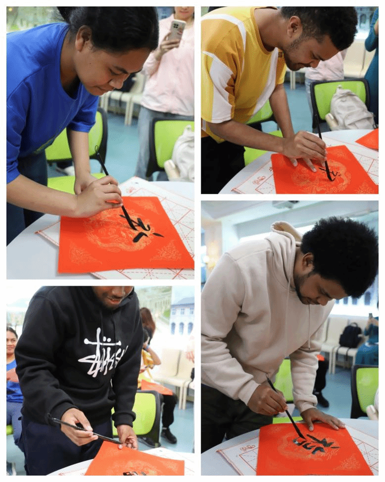 来自基里巴斯的留学生Susana说:“十分高兴能参加这次主题活动,在听经典诵读和学习毛笔书写的过程中也明白了什么是‘福气’,什么是‘幸福生活’,更加喜欢我们的‘福商’。”
