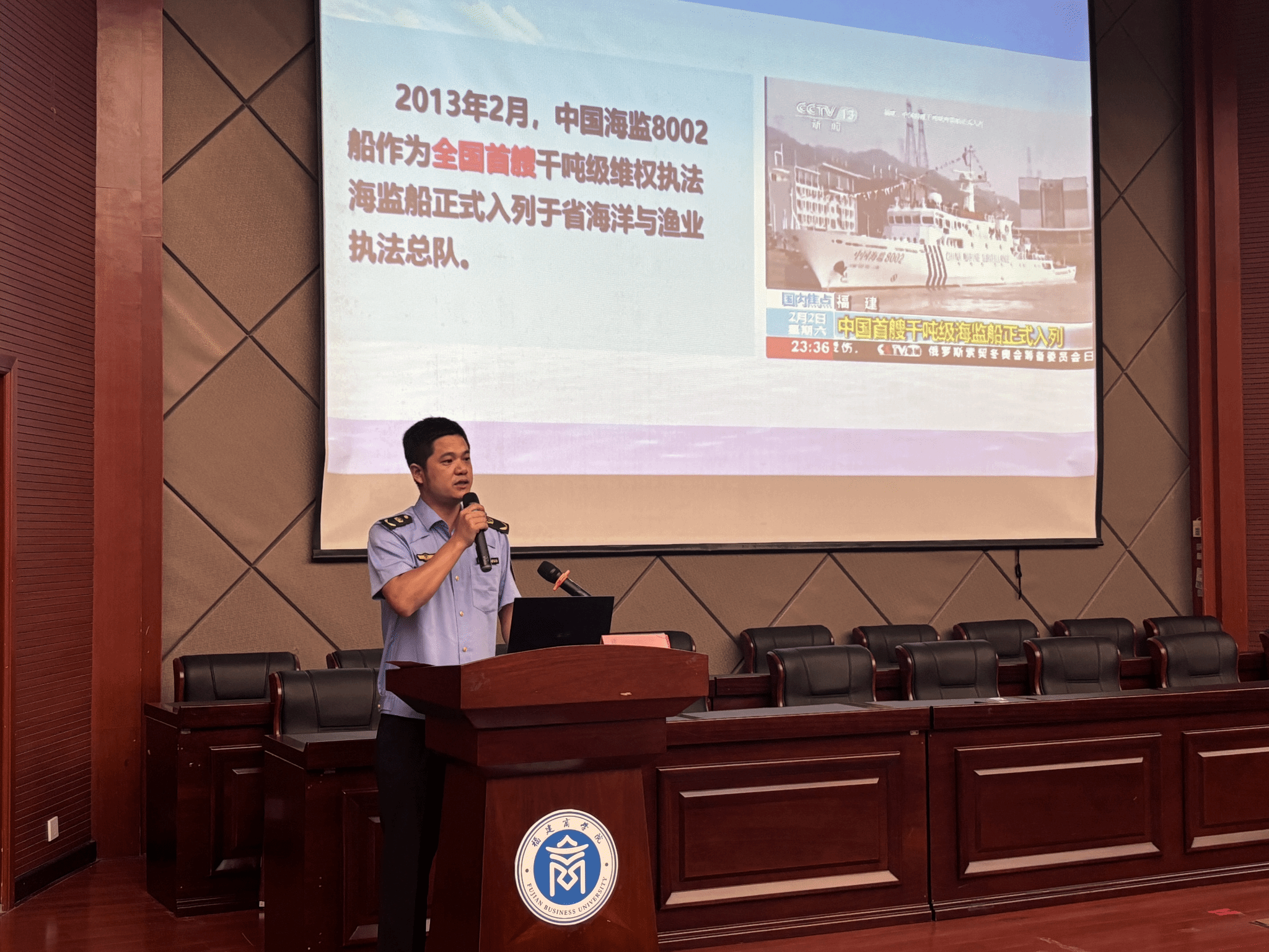 活动中,特勤执法支队团支部书记杨杰作《在风浪中书写的青春答卷》体会分享。他生动形象地描述了禁渔期凌晨蹲守打击违规渔船的经历,队员们在缺水疲惫、海浪颠簸的艰苦环境中,连续11小时坚守执法,展现出“特别能吃苦、特别能战斗”的海渔执法精神,为在场师生呈现了青年执法者的责任与担当;特勤执法支队副支队长章杰从海上执法的艰苦常态讲起,讲述守护海疆战士的“舍小家为大家”,让在场师生深刻理解了海疆守护者的奉献与坚守。