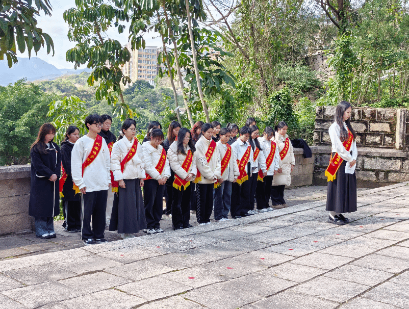 烈士陵园内松柏苍翠,全体人员在纪念碑前肃立,庄严地向烈士们鞠躬、默哀,向为国家和民族献出生命的英烈致以最深切的缅怀。默哀结束后,学生代表薛奕以“赓续先烈志,砥砺青年行”为题,带领师生共同重温革命先烈的英勇事迹,寄托追思之情。先烈们用热血铸就了今日的和平与繁荣,在场的同学深刻领悟作为新时代青年,应当以“明德、诚信、允能、笃行”的校训为指引,勇担使命,不负时代重托,为实现中华民族伟大复兴贡献自己的力量。