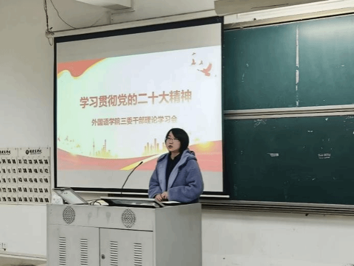会上,老师领学,师生共学、分享心得。翁老师为同学们梳理二十大报告的总体框架及其内容逻辑,引导大家要读原文、悟原理,她希望青年学生要发扬历史主动精神,坚定历史自信,主动用青年声音传播中国故事,立足外语专业,用外语传播中国力量。学生会学习部陈佳佳表示吾辈青年要牢记习近平总书记的殷切嘱托,坚定不移跟党走,成为有理想、敢担当、能吃苦、肯奋斗的新时代好青年;艺术团主持队王嘉琳认为,当代青年要把自己的理想同国家和民族的前途命运紧密联系在一起,自觉践行社会主义核心价值观,为全面建设社会主义现代化国家、全面推进中华民族伟大复兴而奋斗。会上师生发言踊跃,学习气氛浓厚。