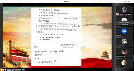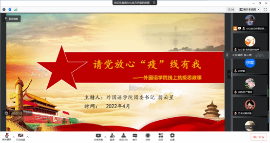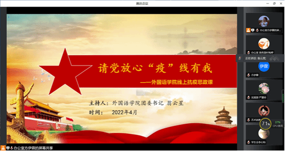 为学习贯彻落实习近平总书记关于疫情防控工作的重要指示批示精神,2022年4月7日,betway西汉姆联官网于线上开展了“请党放心‘疫’线有我”抗疫思政课。本次思政课由学院团委书记翁云星老师主讲,学院全体青年学生干部参加学习。
